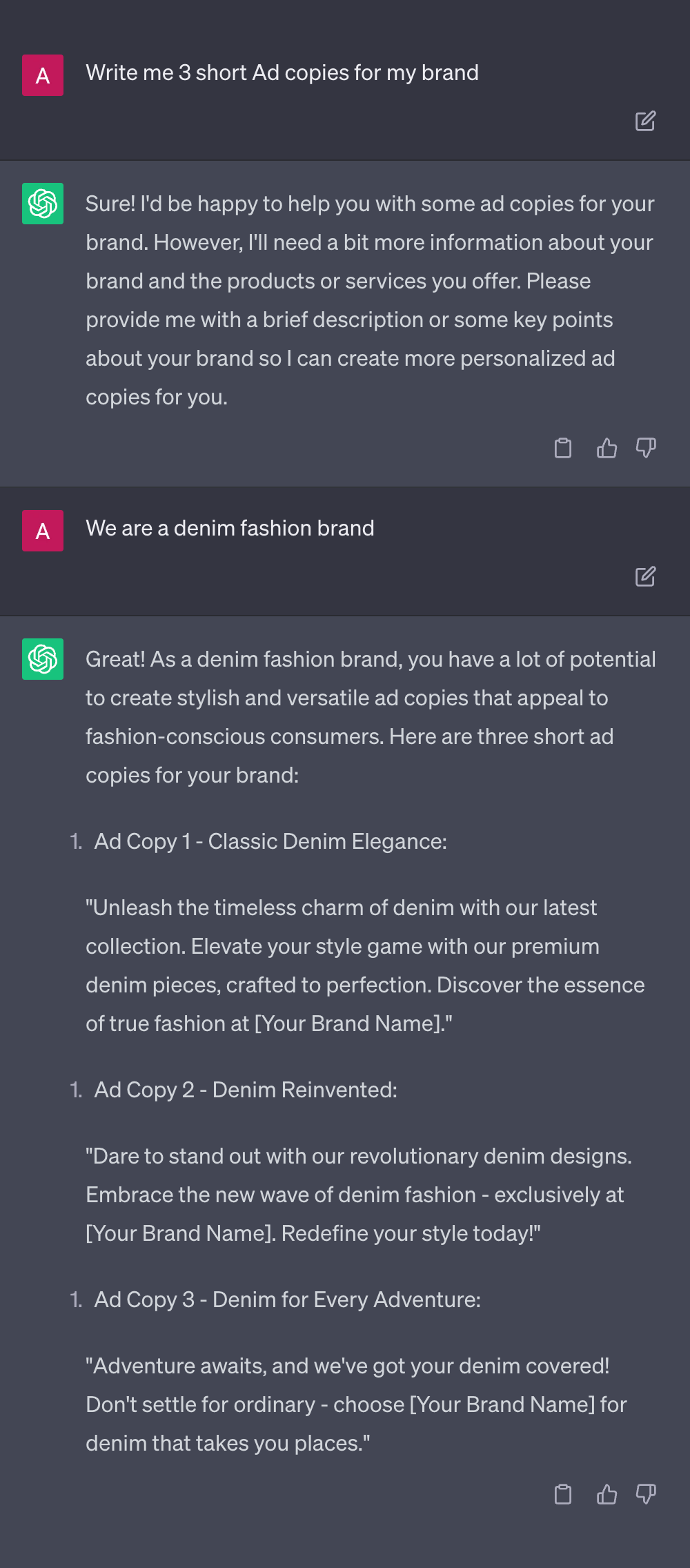 ChatGPT is not able to understand your business context unless it has access to it. You will constantly have to instruct it on what your business is, what you sell, and who your target audience is. This has to be done every time you will use the tool.